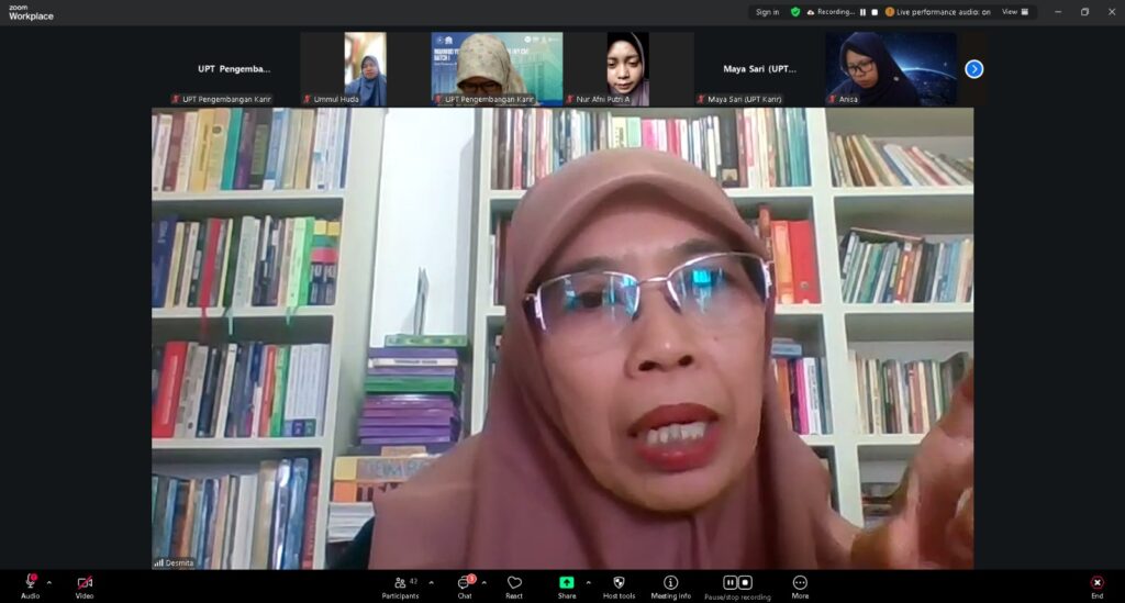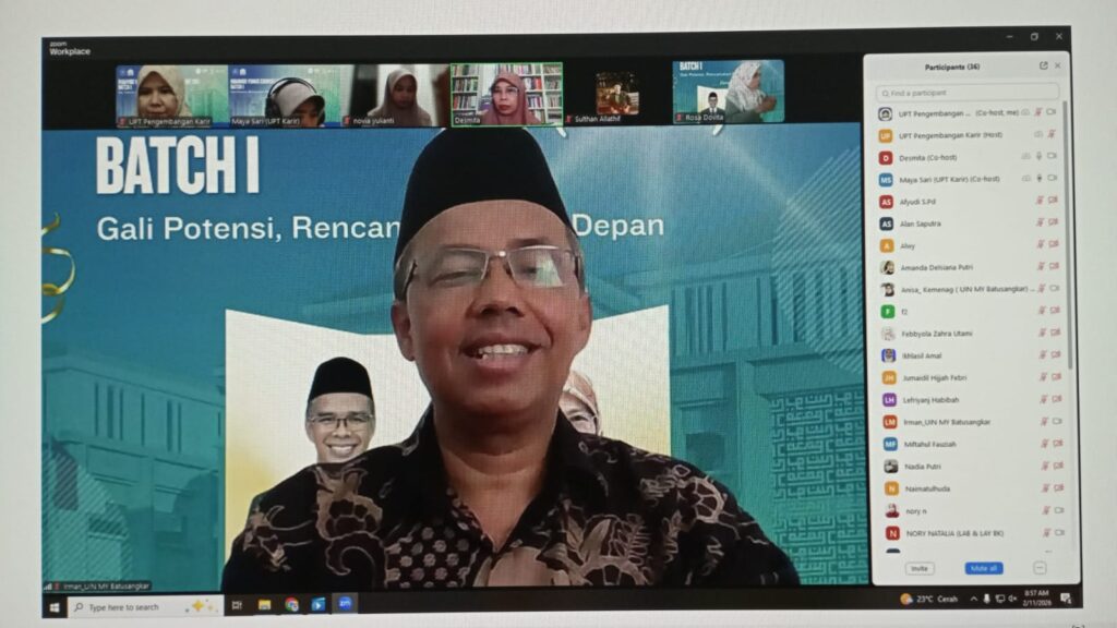 Batusangkar (11/2) — Semangat dan antusias mahasiswa memenuhi ruang virtual zoom meeting pada pagi hari Rabu 11 Februari 2025. Puluhan mahasiswa dengan senyum semangat mengikuti Mahmud Yunus Counseling Month (MY CM) Batch I yang digelar UPT Karir UIN Mahmud Yunus Batusangkar. Mengusung tema “Gali Potensi, Rencanakan Masa Depan”, kegiatan ini menjadi ruang refleksi sekaligus motivasi bagi mahasiswa untuk mulai menata arah hidupnya. Acara dibuka langsung oleh Wakil Rektor Bidang Kemahasiswaan, Kerja Sama, dan Alumni, Dr. Irman, M.Pd.