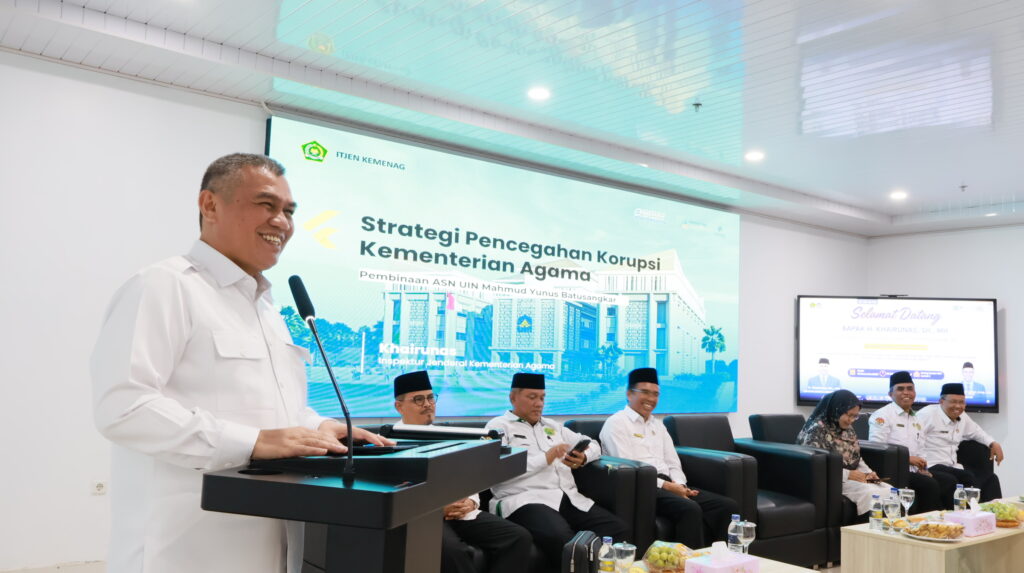 Batusangkar — “Integritas ASN bukan sekadar retorika birokrasi, tetapi wujud nyata dari komitmen ibadah dan tanggung jawab kepada Allah SWT.” Ungkapan inilah yang mengawali penguatan integritas aparatur sipil negara (ASN) yang disampaikan Inspektur Jenderal Kementerian Agama RI, H. Khairunas, S.H., M.H., dalam kegiatan Penguatan Integritas ASN dan Tata Kelola Perguruan Tinggi yang Transparan dan Akuntabel di UIN Mahmud Yunus Batusangkar, Senin (29/12/2025).
