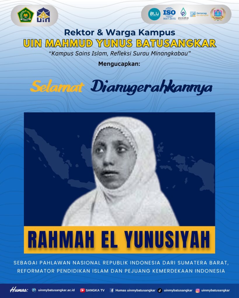 Batusangkar – Keluarga besar Universitas Islam Negeri (UIN) Mahmud Yunus Batusangkar menyampaikan apresiasi dan rasa syukur atas penganugerahan gelar Pahlawan Nasional kepada Rahmah El-Yunusiyah, tokoh perempuan visioner asal Sumatra Barat yang berkontribusi besar dalam pendidikan Islam, khususnya pemberdayaan perempuan.