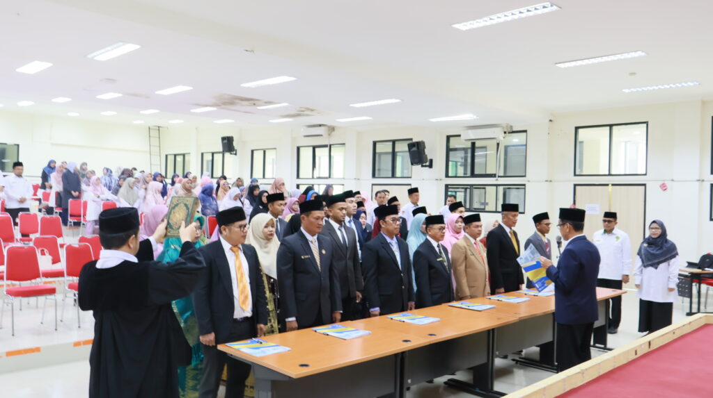 Batusangkar — Dalam rangka menjaga kesinambungan tata kelola kelembagaan serta memperkuat profesionalisme aparatur kampus, Rektor Universitas Islam Negeri (UIN) Mahmud Yunus Batusangkar melantik dan mengambil sumpah pejabat administrator, pejabat pengawas, serta pejabat pelaksana akademik di lingkungan UIN Mahmud Yunus Batusangkar, Senin (5/1/2026), bertempat di Aula Fakultas Ekonomi dan Bisnis Islam (FEBI) Lantai III.