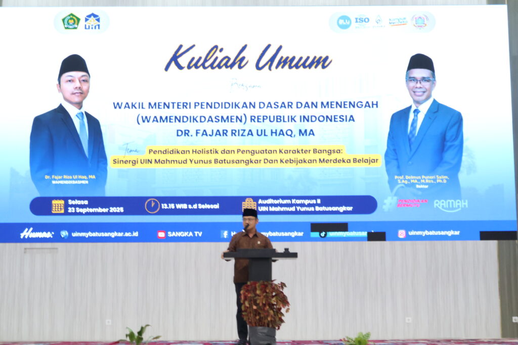 Batusangkar – Universitas Islam Negeri (UIN) Mahmud Yunus Batusangkar memalui Fakultas Tarbiyah dan Ilmu Keguruan kembali menghadirkan agenda akademik bergengsi. Kali ini, kampus yang berakreditasi Unggul tersebut kedatangan tamu penting dari Wakil Menteri Pendidikan Dasar dan Menengah (Wamendikdasmen) RI, Dr. Fajar Riza Ul Haq, M.A, selasa (23/9/2025). Kuliah umum yang berlangsung di Auditorium Kampus II ini mengangkat tema “Pendidikan Holistik dan Penguatan Karakter Bangsa: Sinergi UIN Mahmud Yunus Batusangkar dan Kebijakan Merdeka Belajar.”